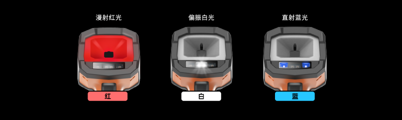 • 【先进的成像系统】提供偏振光、直射光、漫射光三种光源形态,以及红、白、蓝三色 光源,智能切换应对各种场景、材质提供完美成像方案。