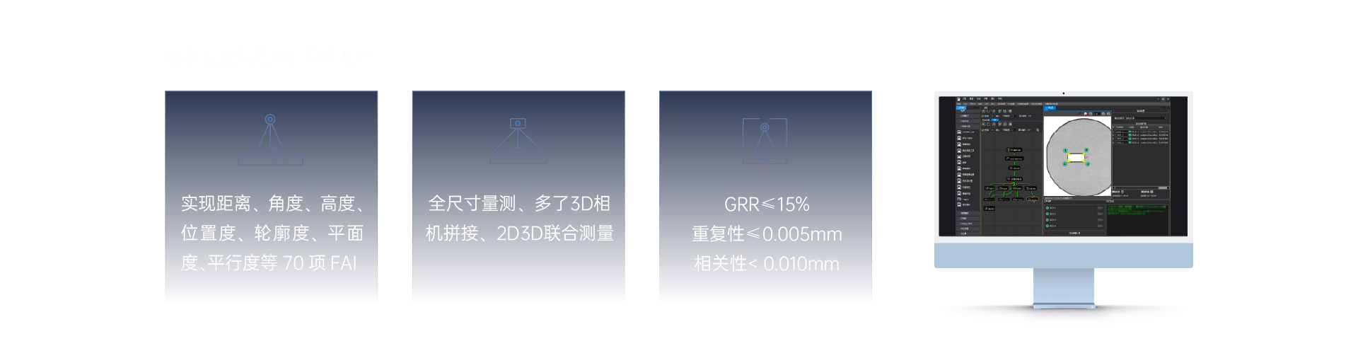 自动坐标系统、流程图 + Bullet Point的图形化交互、无代码、亚像素边缘提取、丰富的检测测量工具、高效灵活输出、2D 3D测量、跨平台SDK使调用